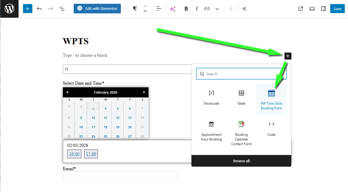 - To insert the WP Time Slots Booking Form calendar form into some content or post use the icon that will appear when editing contents